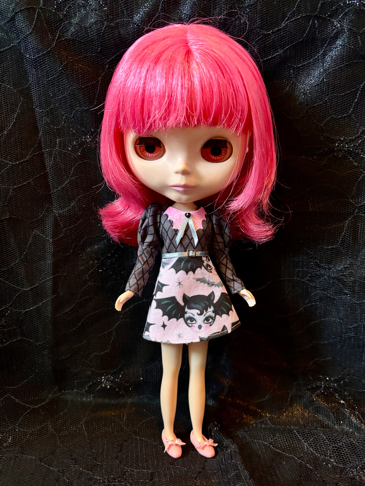 Made for Blythe dolls, this dress is a fun retro style with long mutton sleeves and an a-line mini skirt. Crafted from a mix of fabrics, the bodice is complete with a batwing shaped pink glitter collar, ribbon "tie" and tiny heart button accent, and the waist is cinched with a (non-removable) thin ribbon belt with a tiny metal buckle. Dress is fully lined at the bodice and stays closed in back with two metal snaps.