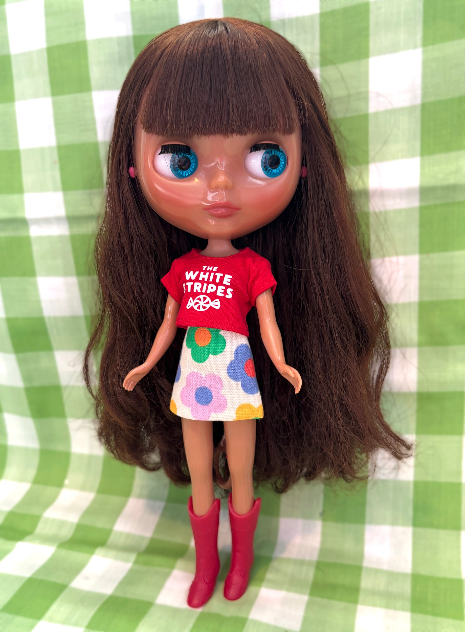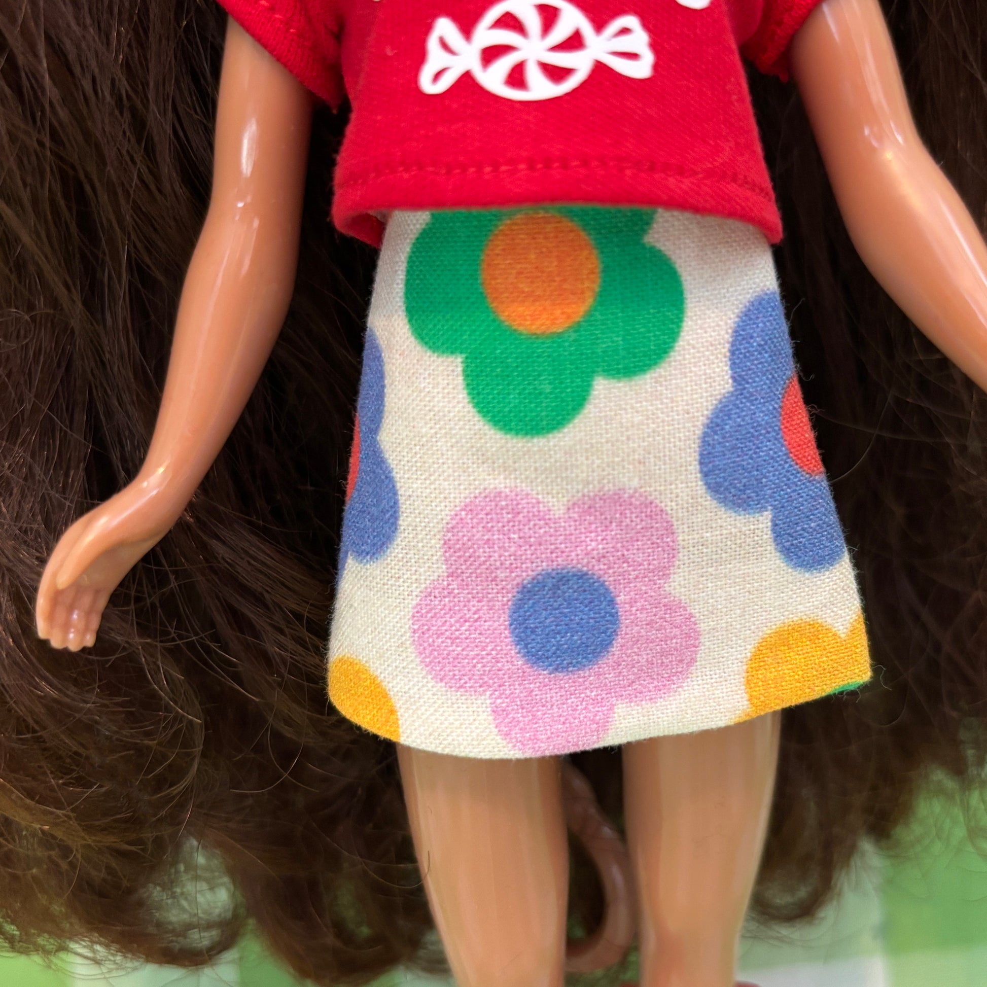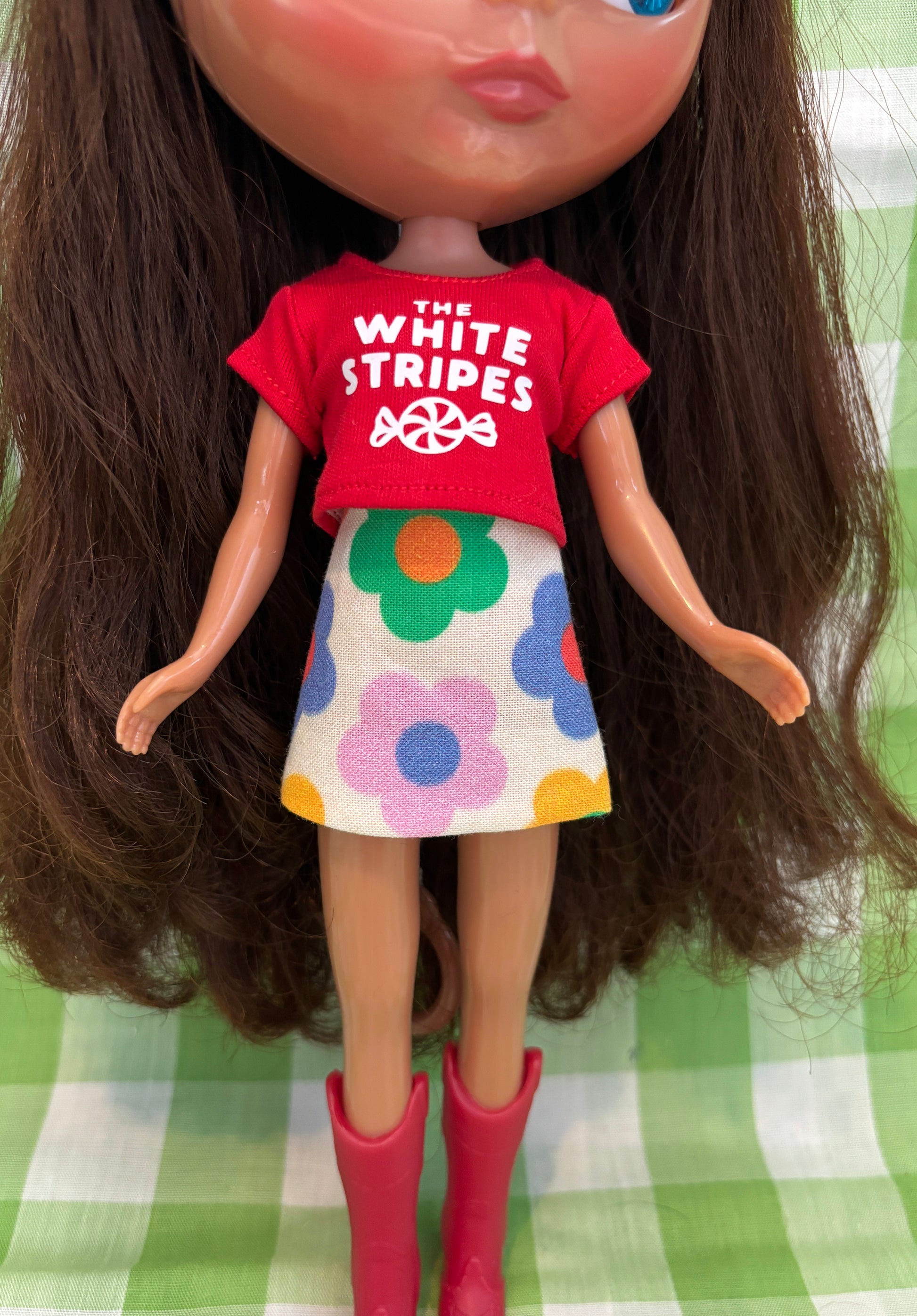 Brighten up Blythe's wardrobe with this mod mini skirt in a bold big daisy print on white! This a-line mini skirt fastens at the back with velcro for easy on and off and looks great when paired with my crop tees.