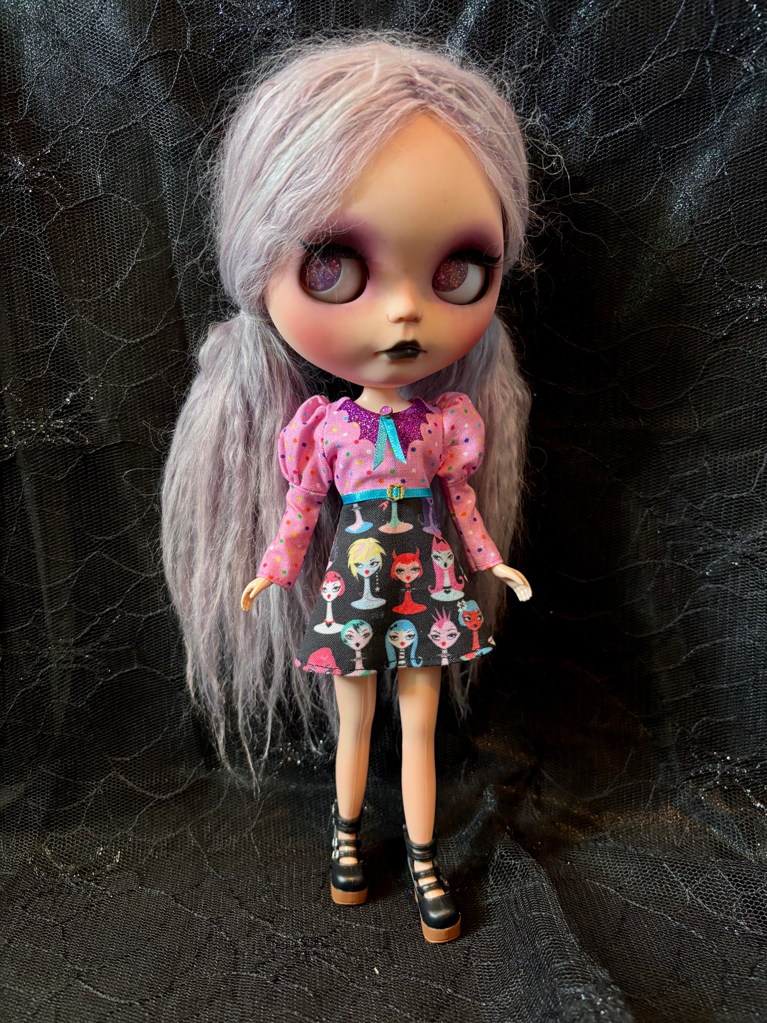 Made for Blythe dolls, this dress is a fun retro style with long mutton sleeves and an a-line mini skirt. Crafted from a mix of fabrics, the bodice is complete with a batwing shaped purple glitter collar, ribbon "tie" and tiny button accent, and the waist is cinched with a (non-removable) thin ribbon belt with a tiny metal buckle. Dress is fully lined at the bodice and stays closed in back with two metal snaps.