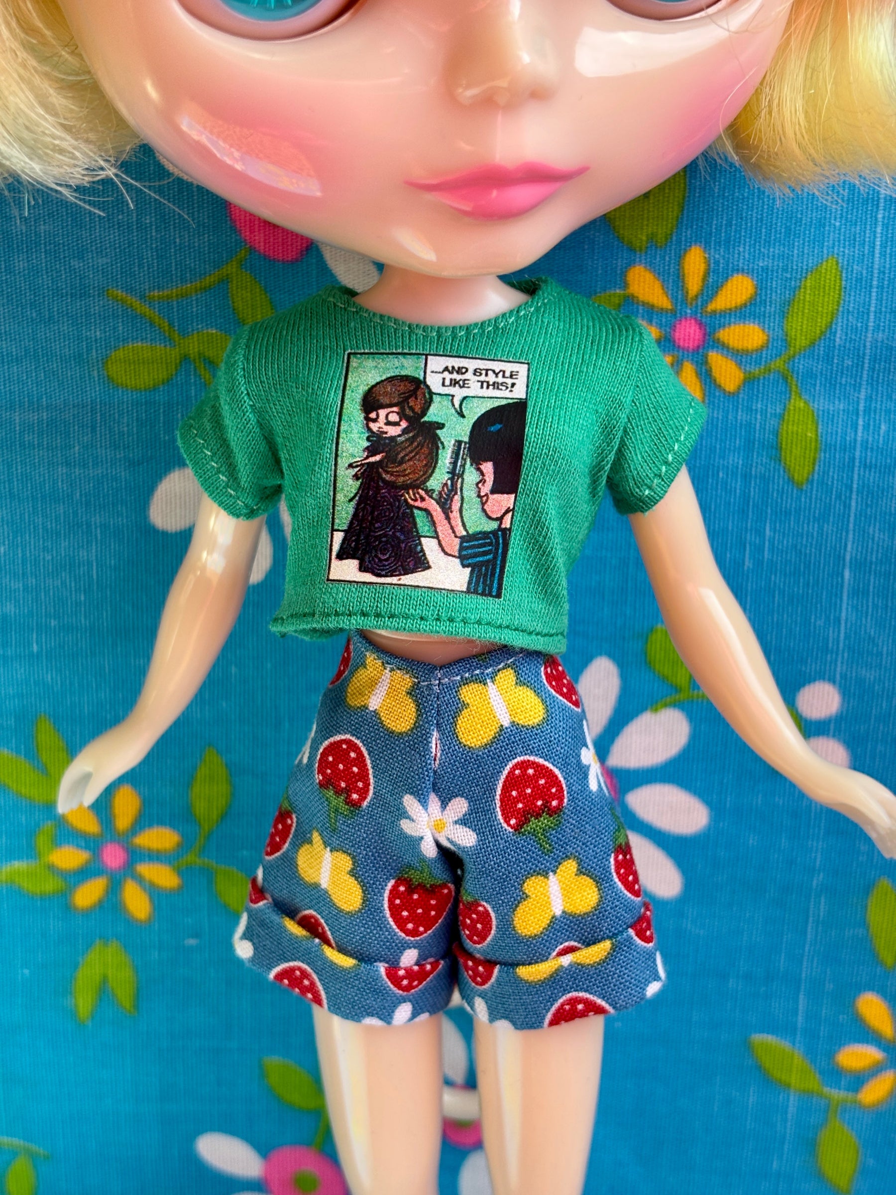 This Blythe sized tee features a vintage Kenner comic graphic on a green crop top. This style looks great with a variety of bottoms! The back stays closed with velcro for easy on and off.