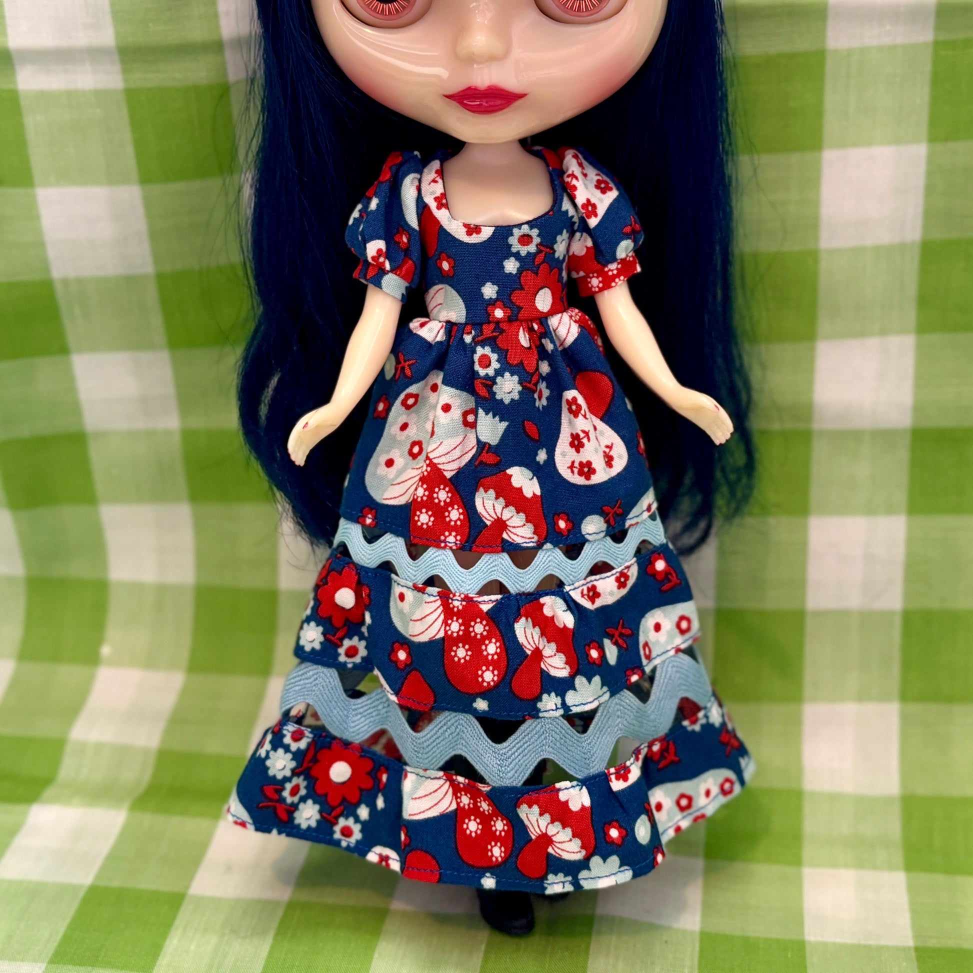 Falling at the ankle, this blue & red mushroom print maxi dress for Blythe features ruffled tiers with vintage ric-rac trim in between for a subtle peekaboo. The bodice has a flattering square neckline and is complete with fun puff sleeves.