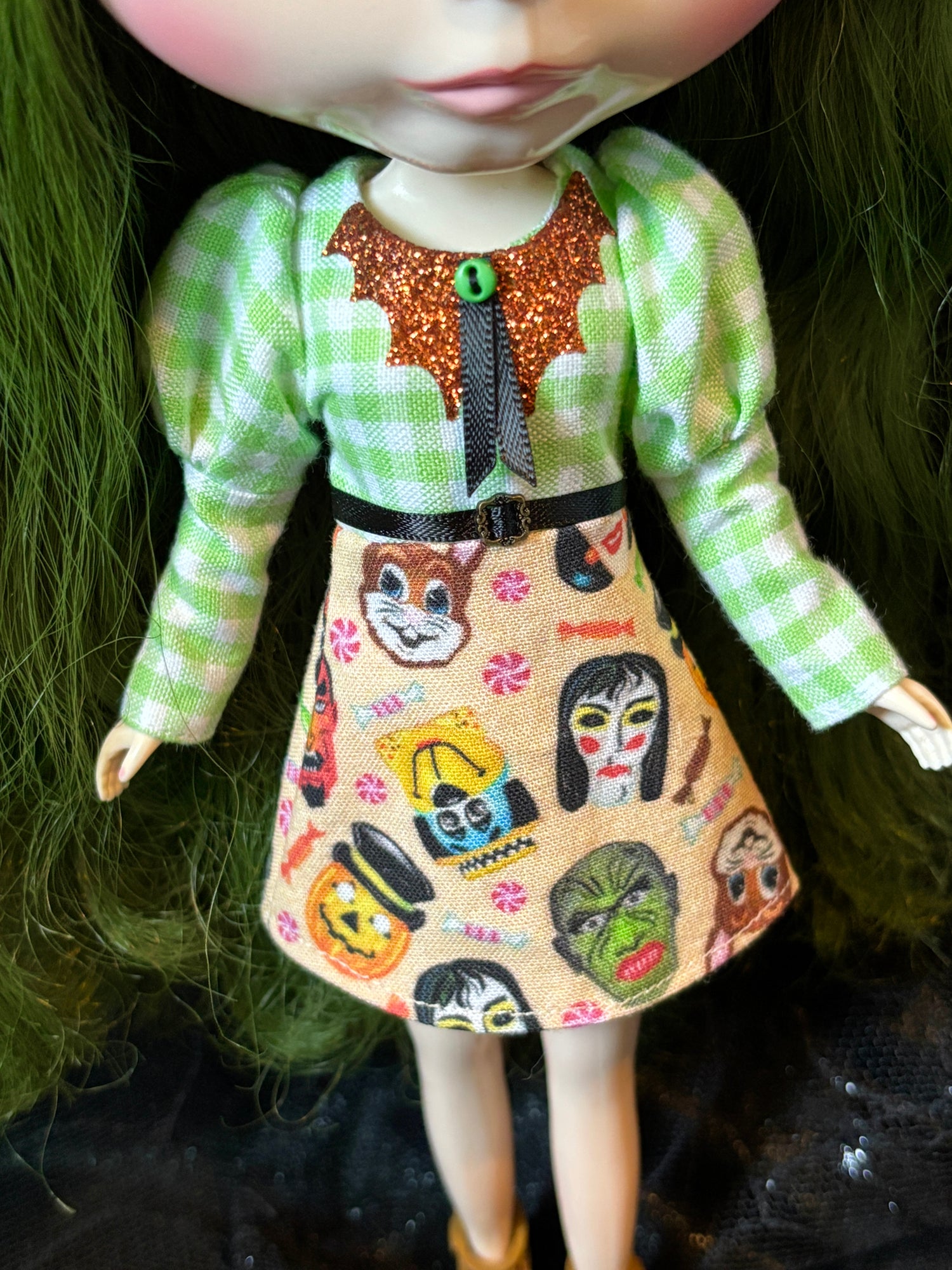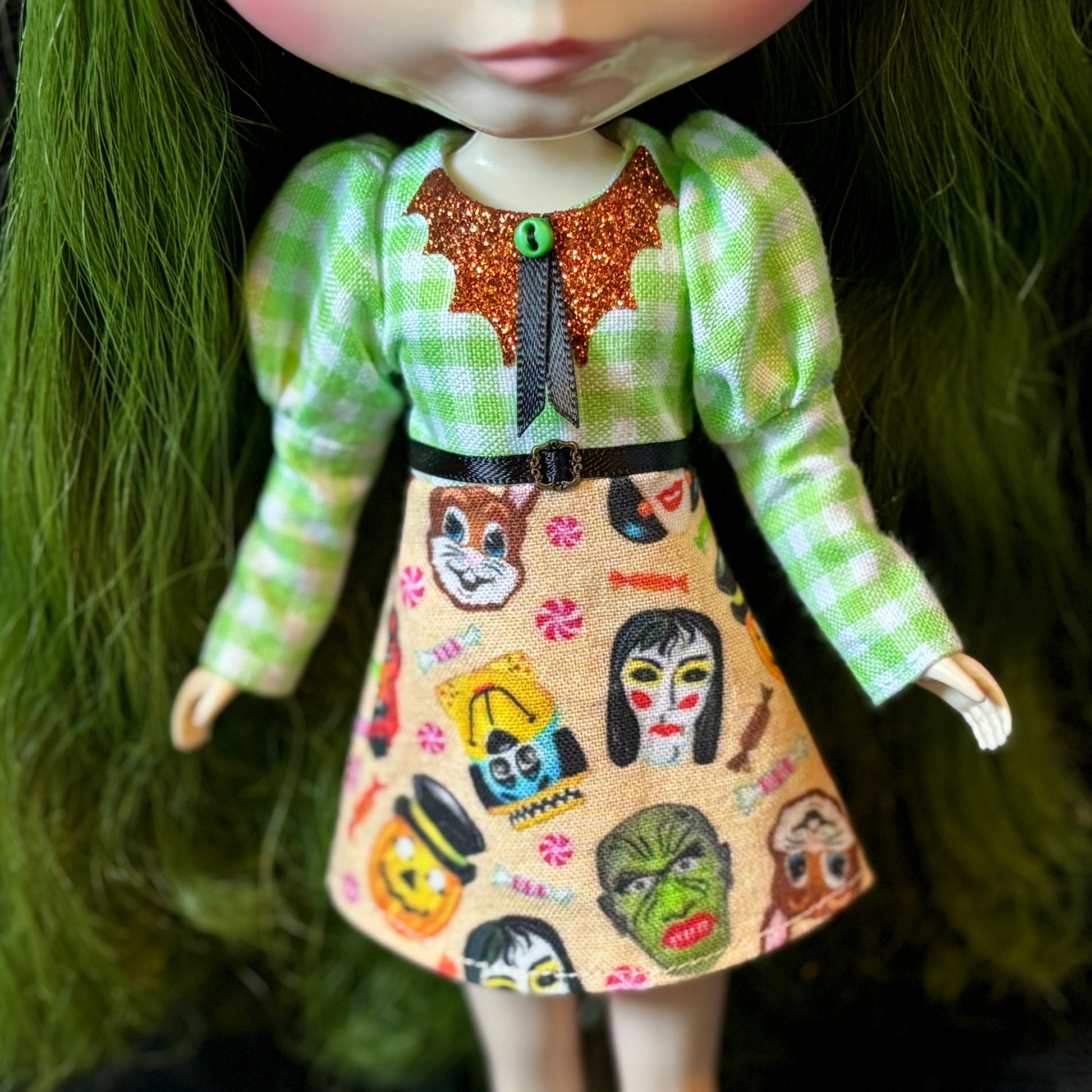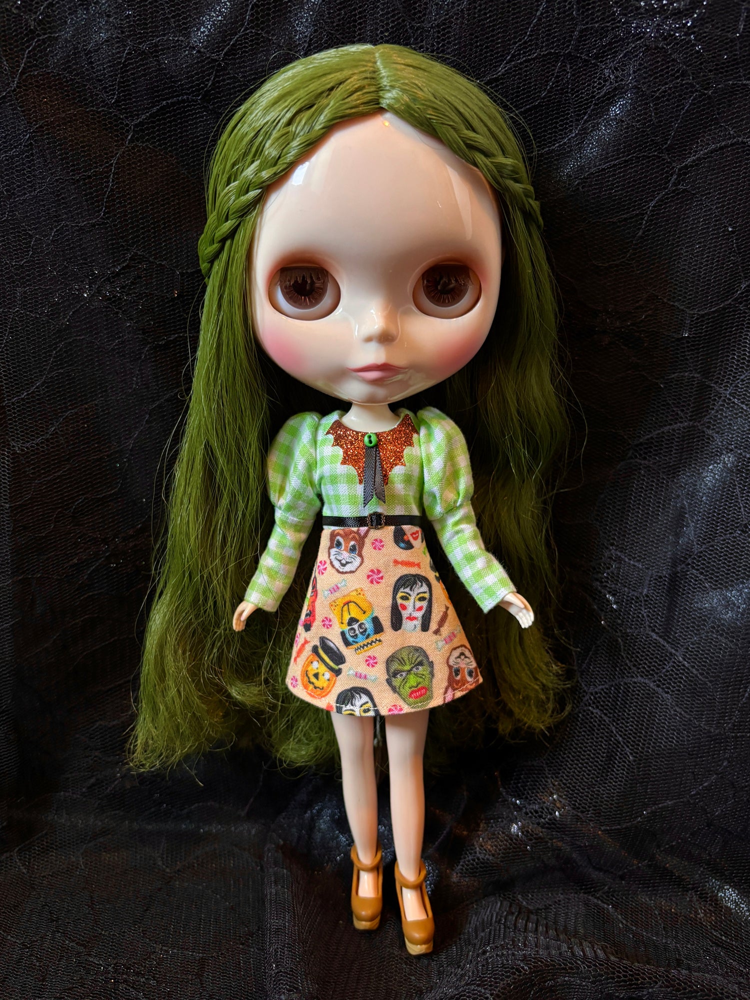 Made for Blythe dolls, this dress is a fun retro style with long mutton sleeves and an a-line mini skirt. Crafted from a mix of fabrics, the bodice is complete with a batwing shaped orange glitter collar, ribbon "tie" and tiny button accent, and the waist is cinched with a (non-removable) thin ribbon belt with a tiny metal buckle. Dress is fully lined at the bodice and stays closed in back with two metal snaps.