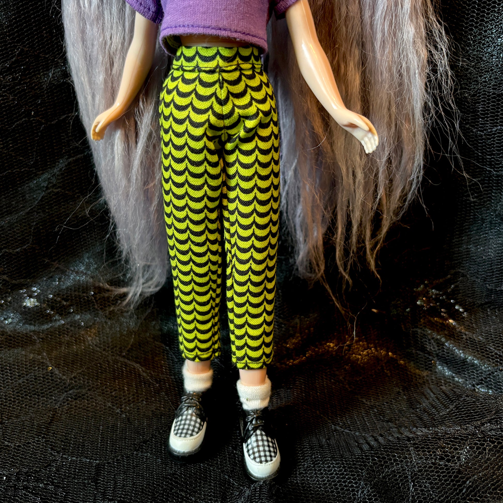 Add some spooky spirit to Blythe's wardrobe with these fun Beatnik Baby Pants in green! Inspired by cigarette pants of the 1950s, they feature a slim leg, high waist, and a cute cropped length. They fasten with a snap at the back. They pair great with my graphic tees too!