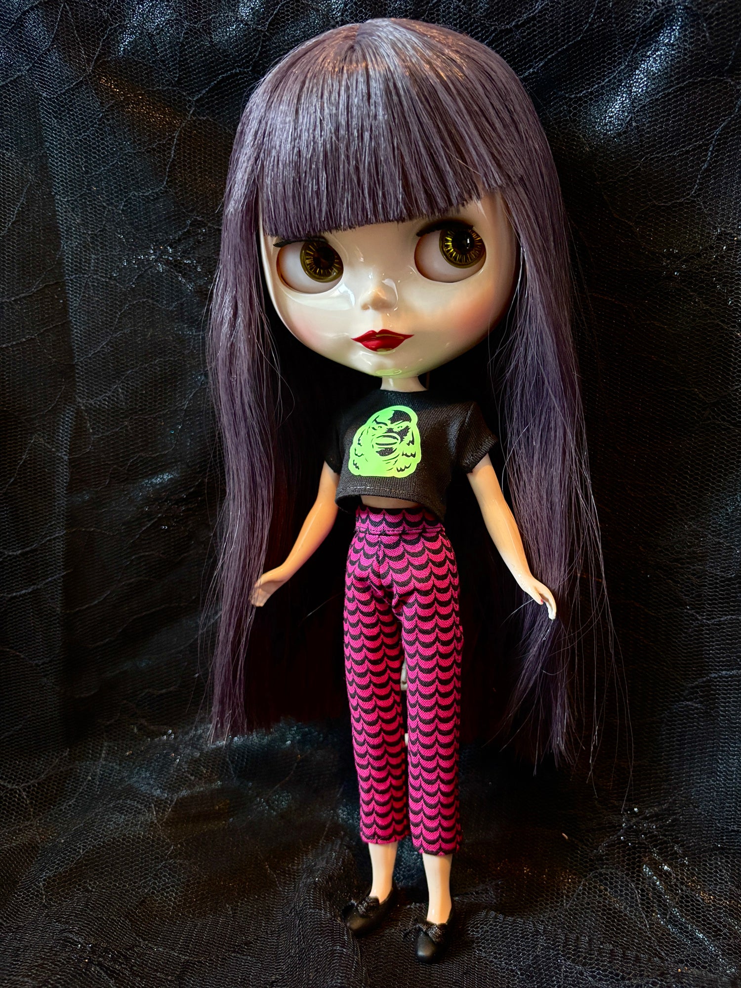 Add some spooky spirit to Blythe's wardrobe with these fun Beatnik Baby Pants in purple! Inspired by cigarette pants of the 1950s, they feature a slim leg, high waist, and a cute cropped length. They fasten with a snap at the back. They pair great with my graphic tees too!